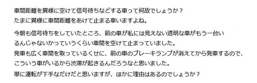 信号待ちなどの一端停止時の車間距離を異様に空けるクルマが目立つ事。